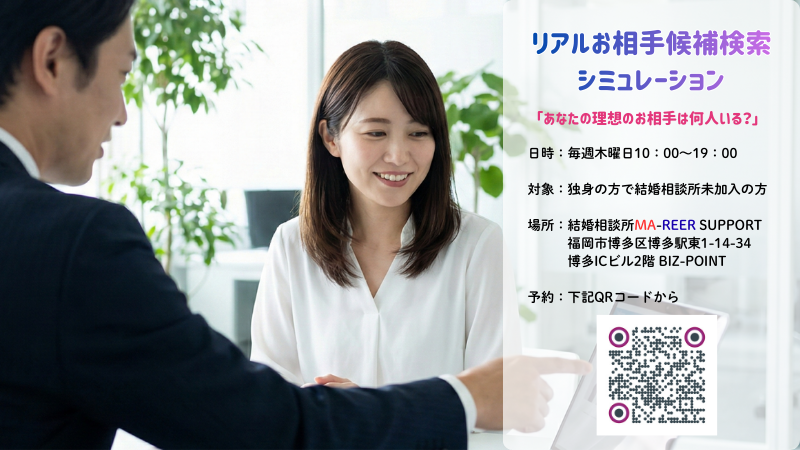 - 【個別】1/29リアルお相手検索体験会「あなたの理想のお相手が見つかるかも?」 ~未来のパートナー候補数を検索してみませんか?~ 結婚相談所に入会して、「本当に出会えるの?」「どんな会員がいるの?」という疑問をお持ちではありませんか? 博多駅から徒歩5分、福 […]
